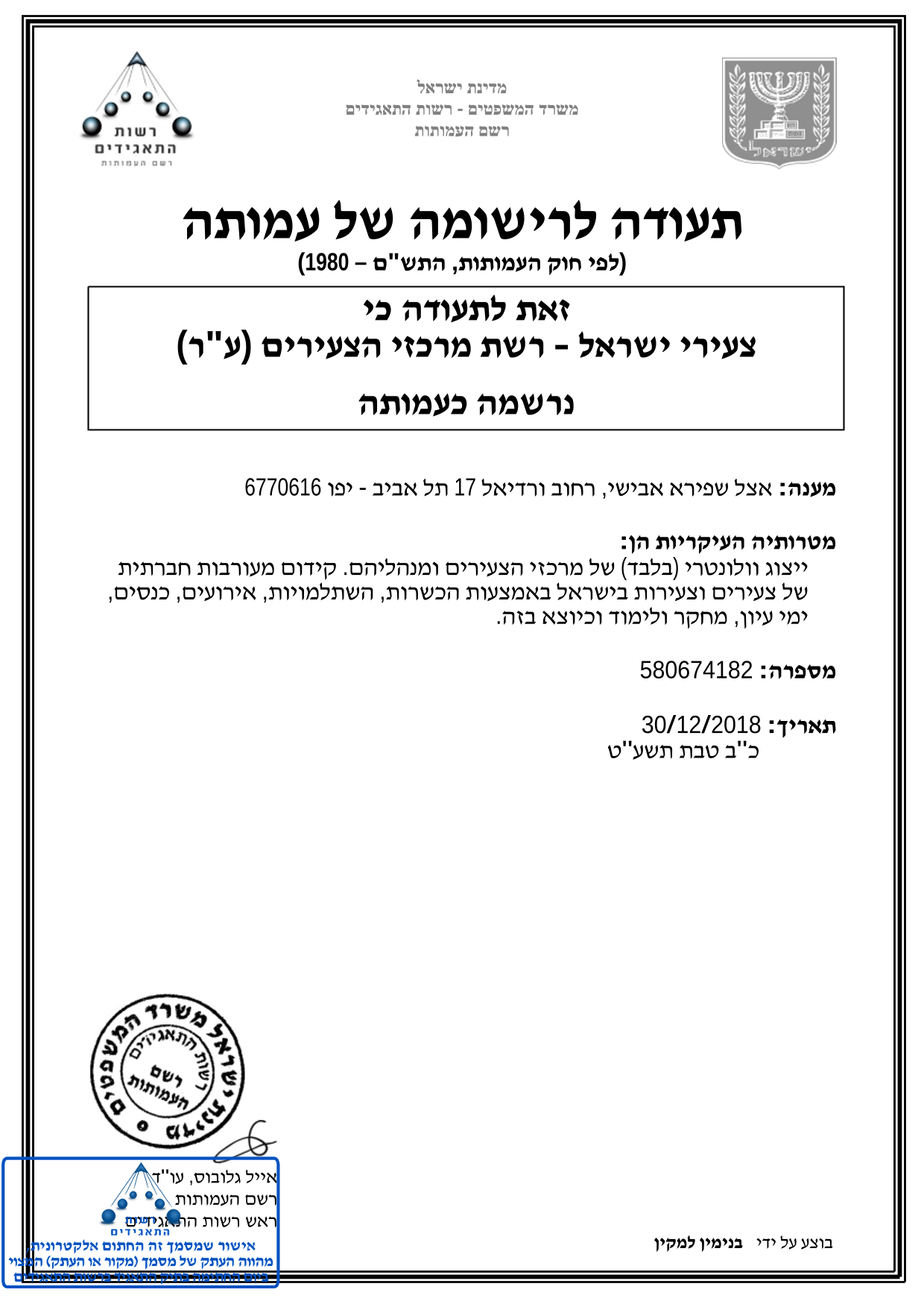 צעירי ישראל- רשת מרכזי הצעירים (ע”ר) 580674182אנו מאמינים כי הדרך של כל ארגון לשפר את פעילותו עוברת דרך חשיפת כל המידע הרלוונטי לעיני הציבור לשם קבלת ביקורת.כלל המסמכים בעמוד זה הועלו לאתר האינטרנט כחלק ממדיניות השקיפות שלנו כרשת, ואין לעשות במסמכים הללו כל שימוש שהוא למעט צפייה בהם. תעודת רישום עמותה תקנון רשת מרכזי הצעירים תוכנית עבודה ותקציב תוכנית עבודה ותקציב 2022תוכנית עבודה ותקציב 2021 דוחות כספיים דוחות כספיים 2021דוחות כספיים 2020דוחות כספיים 2019 בחירות ועד מנהל ויו"ר לרשת בחירות לוועד מנהל וליו"ר יתקיימו ב 5/2022 פרוטוקולים פרוטוקול 6/2022פרוטוקול 2/2022פרוטוקול 12/2021פרוטוקול 7/2021פרוטוקול 5/2021פרוטוקול 2/2021פרוטוקול 11/2020פרוטוקול 3/2020פרוטוקול 9/2019 פניה לוועדת ביקורת.