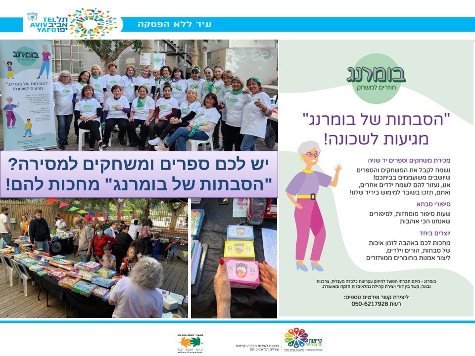 2. ניתן לשכפול בכל הארץ – "בומרנג" פותח כמודל פשוט שניתן לשכפול בכל רשות. בשל שיתוף הפעולה הרחב מעיריית תל אביב התחלנו פעילותנו בעיר, אך מדובר במיזם בעל אופק רחב וגמיש שניתן להתאמה בהתאם לצרכי האוכלוסיה המקומית – הן הגמלאים והן התושבים.